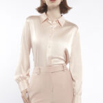 เสื้อเชิ้ตแขนยาว แบรนด์ ESPADA ผ้าซาตินหรูหราในโทนสีพีชอ่อนโทนสวีทหวาน ใส่แมทช์ง่ายกับกางเกงได้หลายสี ตัดเย็บดีไซน์คอปกทรงเชิ้ต เนื้อผ้าทอแบบมีความมันวาว แต่งแถบกระดุมด้านหน้าเป็นกระดุมเคลือบเงาสีทองเพิ่มดีกรีความหรูหราแบบเต็มแม็กซ์ ไอเดียใส่แมทช์กับกางเกงสีขาวสไตลิ่งแบบเก็บชายเสื้อ คอมพลีทลุคสวยด้วยรองเท้าส้นสูงสีอ่อน
