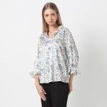 เสื้อเบลาส์คอวี ทรงหลวมใส่บาย เนื้อสัมผัสนุ่ม มีน้ำหนักเบา ใส่แล้วไม่ร้อนอึดอัด แขนสามส่วนแต่งดีเทลปลายขอบแขนระบาย ลายดอกไม้ในโทนสีออฟไวท์