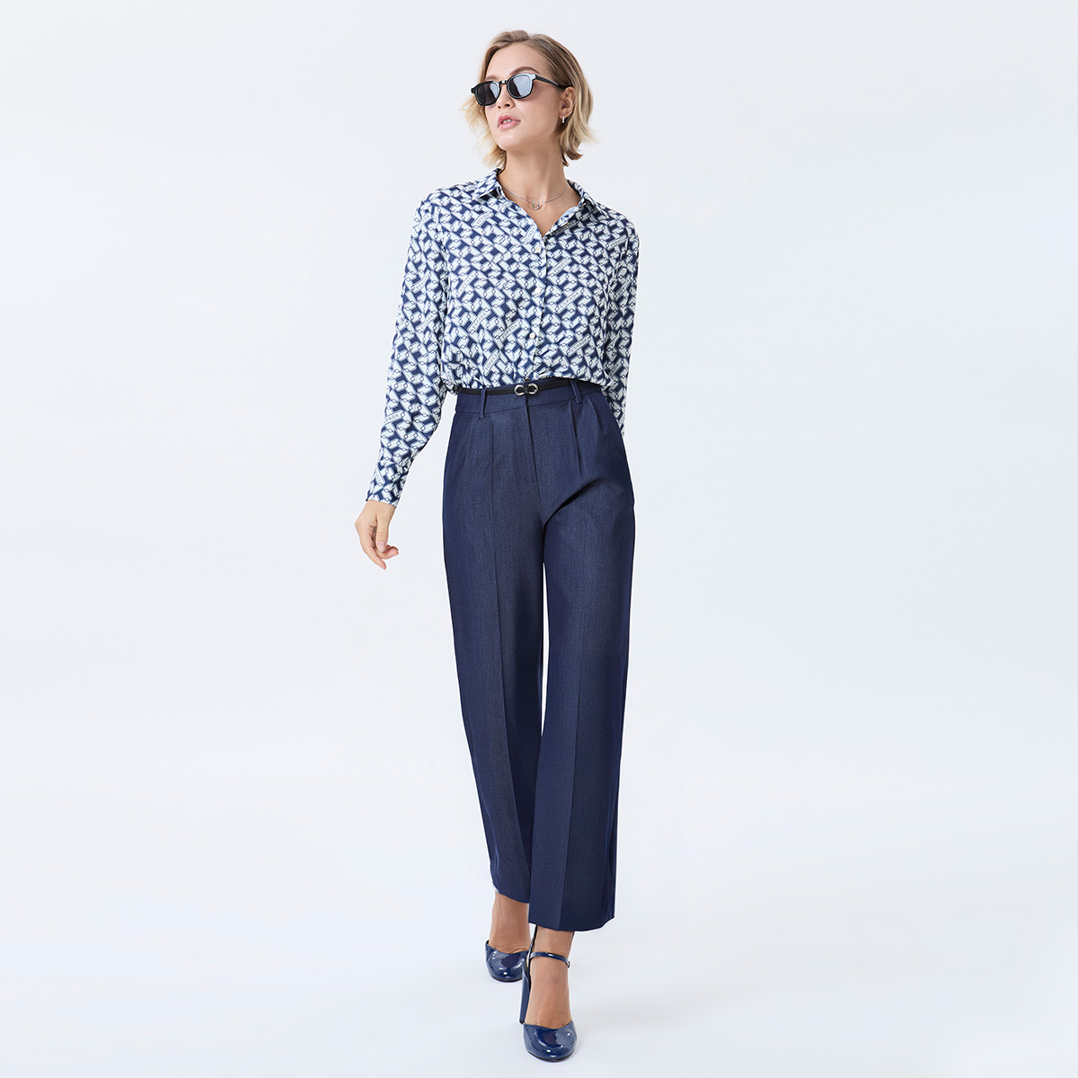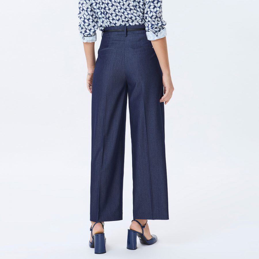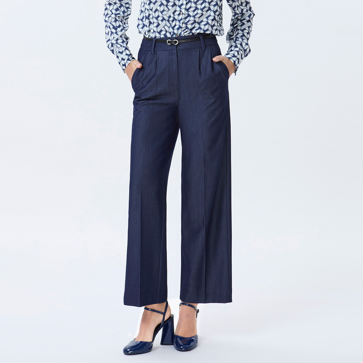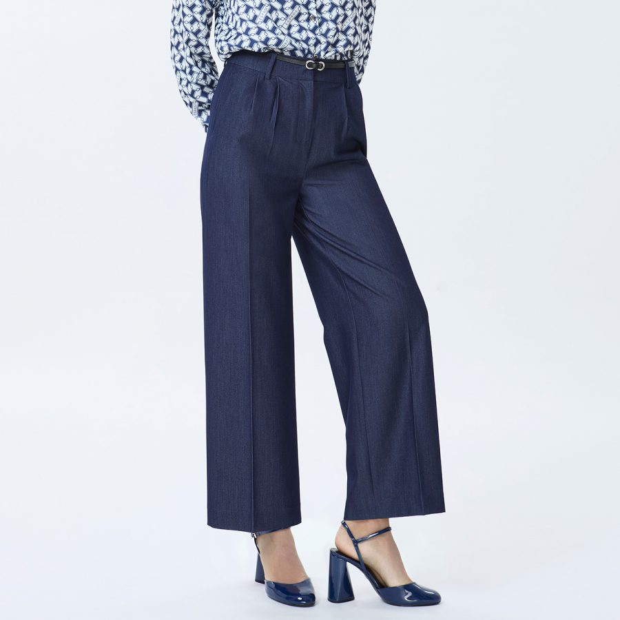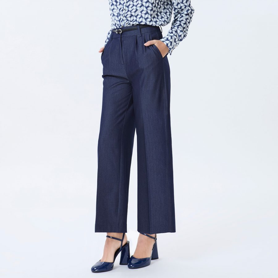 สร้างลุคที่ดูมั่นใจด้วย กางเกงขายาวทรงขากว้างจับจีบหน้า สีน้ำเงิน ผลิตจากผ้าเนื้อสัมผัสคล้ายเดนิมที่ให้ความรู้สึกนุ่ม พลิ้ว และสวมใส่สบาย ดีไซน์ขากว้างช่วยพรางสัดส่วนให้ดูสูงโปร่ง พร้อมดีเทลจีบหน้าที่เพิ่มความมีมิติและความเนี้ยบในแบบโมเดิร์น ตกแต่งด้วยกระเป๋าหลังทรงเรียบและโลโก้โลหะ ESPADA ที่สะท้อนความพิถีพิถัน เหมาะสำหรับลุคทำงาน หรือลุควันพิเศษที่ต้องการความโก้หรู และมีระดับในทุกมุมมอง