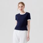 เสื้อนิต แขนสั้น สีน้ำเงินเข้ม ดีไซน์คอกลม แต่งขอบสีขาวตัดกับตัวเสื้อที่บริเวณคอและปลายแขนสั้นสองข้าง ใส่สบายแบบสวมหัวด้วยเทคนิคเย็บแบบผ่าและกลัดกระดุมสีทองที่บริเวณหัวไหล่ ทรงปกติสวมใส่สบาย เนื้อผ้ามีความทิ้งตัว ไม่เกิดรอยยับง่ายเหมาะสำหรับสาว ๆ ที่ต้องการความคล่องตัว และกิจกรรมเยอะ