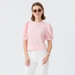 – เสื้อนิตแขนบอลลูน ถักทอเจอร์ซี่คอกลม สีชมพู แขนบอลลูน
