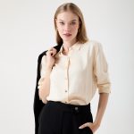 -เสื้อเชิ้ตแขนยาวสีเบจ ดีไซน์ปกแหลมคลาสสิก