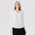 เสื้อเบลาส์ คอวี แขนยาว สีออฟไวท์ ดีไซน์คอปกเชิ้ต แต่งกระดุมสีทองปั๊มตัวอักษร ESPADA ช่วงคอถึงกึ่งกลางตัวเสื้อ กลัดกระดุมในแบบเดียวกับตัวเสื้อที่บริเวณปลายแขน เนื้อผ้าแจ็คการ์ดมีลวดลาย Polka Dot ตลอดทั้งตัว ทรงหลวมใส่สบาย ระบายอากาศได้ดี แมทช์สวยทั้งกับกางเกงและกระโปรงในหลากหลายสีสันและสไตล์