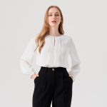 เสื้อเบลาส์ แขนยาว สีออฟไวท์ ใส่สะดวกแบบสวมหัวด้วยดีไซน์การเย็บแบบผ่าสไตล์คอวี และกลัดกระดุมมุกล้อมเพชร โดดเด่นด้วยดีเทลตีเกล็ดด้านหน้าจากคอถึงชายเสื้อ เย็บจับจีบช่วงปลายแขนสไตล์แขนพองและกลัดกระดุมหนึ่งเม็ดที่บริเวณปลายแขน หรูหราด้วยโลโก้ชาร์มสีทองที่ชายเสื้อด้านซ้าย มีสลิปผ่าด้านข้างเพิ่มกิมมิคให้กับผู้สวมใส่ เนื้อผ้านุ่มเบา ใส่สบาย ไม่ร้อนเหมาะสำหรับอากาศเมืองไทย