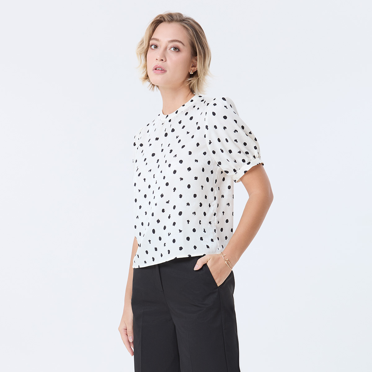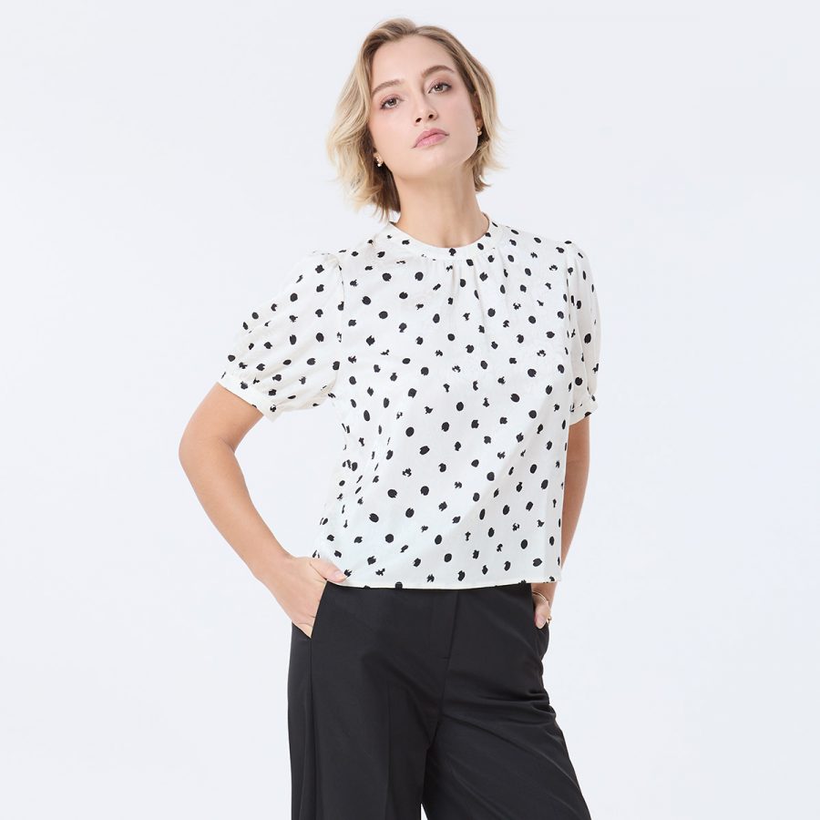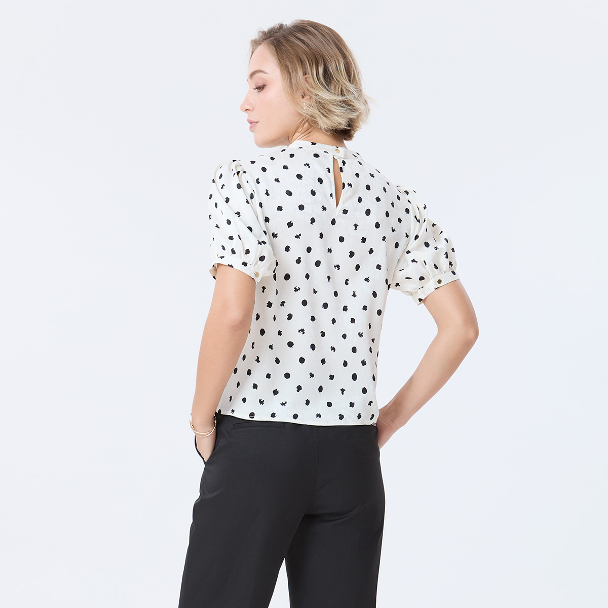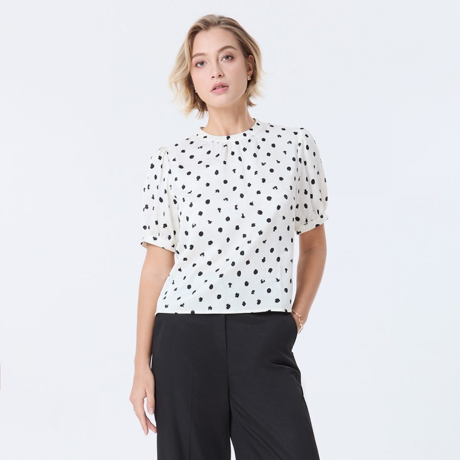 เสื้อเบลาส์แขนสั้นคอกลม สีออฟไวท์ ดีไซน์เรียบหรูแต่แฝงความอ่อนโยน มาพร้อมเทคนิคการเย็บจับจีบช่วงคอ หัวไหล่และปลายแขน เพิ่มวอลลุ่มอย่างลงตัว ตกแต่งด้วยกระดุมโทนสีทองที่ช่วยเสริมความหรูหราอย่างมีระดับ โดดเด่นด้วยเนื้อผ้าลายดอกไม้ทอในตัวที่ให้มิติและความละเอียดอ่อน ผสมกับลาย polka dot สีดำ สะท้อนแรงบันดาลใจจากธรรมชาติ และTimeless ไว้ด้วยกัน พร้อมมอบสัมผัสหรูหราและความนุ่มนวล สามารถแมตช์ได้อย่างลงตัวกับกางเกงหรือกระโปรงโทนสีอ่อน เพื่อสร้างลุคที่ดูสุภาพ เรียบหรู และสง่างามได้ในทุกช่วงเวลา