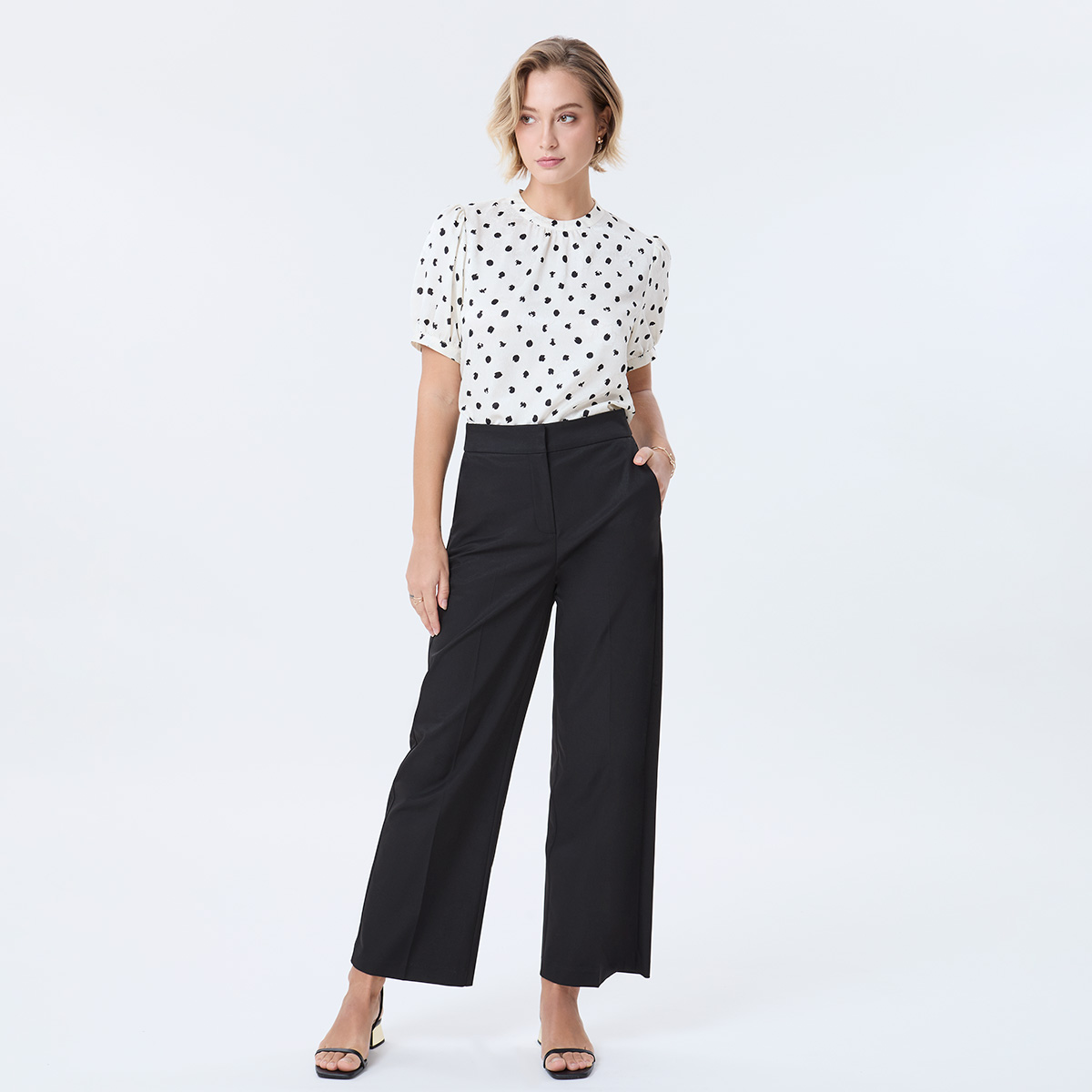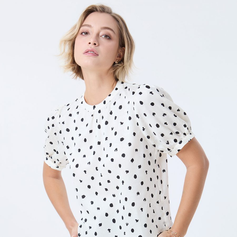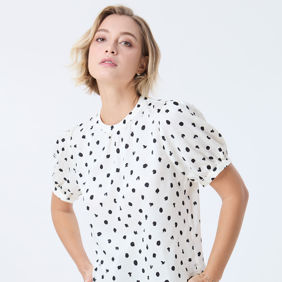 เสื้อเบลาส์แขนสั้นคอกลม สีออฟไวท์ ดีไซน์เรียบหรูแต่แฝงความอ่อนโยน มาพร้อมเทคนิคการเย็บจับจีบช่วงคอ หัวไหล่และปลายแขน เพิ่มวอลลุ่มอย่างลงตัว ตกแต่งด้วยกระดุมโทนสีทองที่ช่วยเสริมความหรูหราอย่างมีระดับ โดดเด่นด้วยเนื้อผ้าลายดอกไม้ทอในตัวที่ให้มิติและความละเอียดอ่อน ผสมกับลาย polka dot สีดำ สะท้อนแรงบันดาลใจจากธรรมชาติ และTimeless ไว้ด้วยกัน พร้อมมอบสัมผัสหรูหราและความนุ่มนวล สามารถแมตช์ได้อย่างลงตัวกับกางเกงหรือกระโปรงโทนสีอ่อน เพื่อสร้างลุคที่ดูสุภาพ เรียบหรู และสง่างามได้ในทุกช่วงเวลา